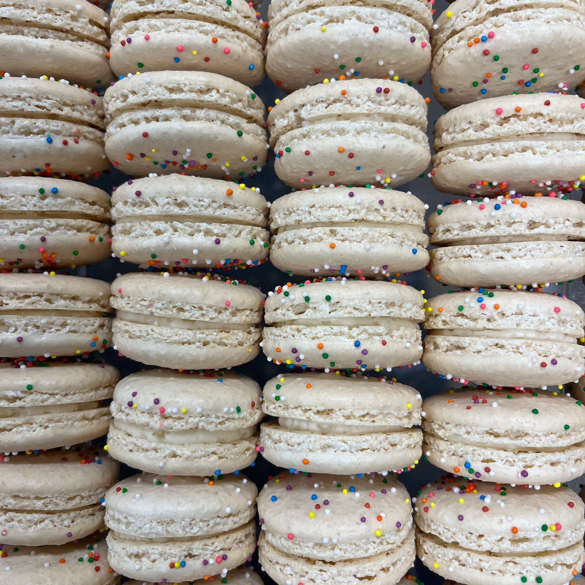 Vanilla macaron shell, filled with vanilla swiss meringue buttercream and sprinkled with colorful nonpareil sprinkles.